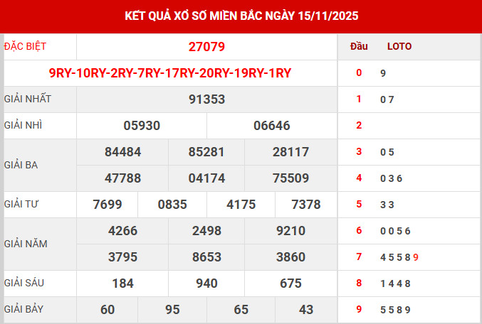 Ngày 15/11/2025, giải đặc biệt của Xổ số Miền Bắc thuộc về dãy số 27079, trong đó cặp 79 là tâm điểm dành cho những ai quan tâm tới các dấu hiệu lặp lại.