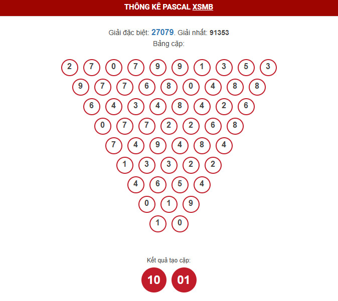 - Dựa vào thống kê Pascal, tham khảo cặp số đặc biệt dễ ra : 10 - 01