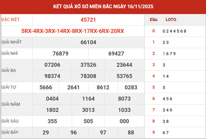 Ngày 16/11/2025, giải đặc biệt của Xổ số Miền Bắc thuộc về dãy số 45721, trong đó cặp 21 là tâm điểm dành cho những ai quan tâm tới các dấu hiệu lặp lại.