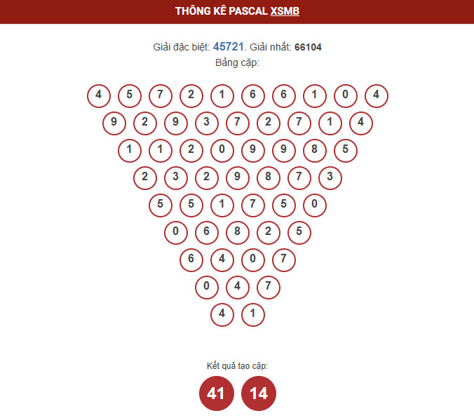 - Dựa vào thống kê Pascal, tham khảo cặp số đặc biệt dễ ra : 41 - 14