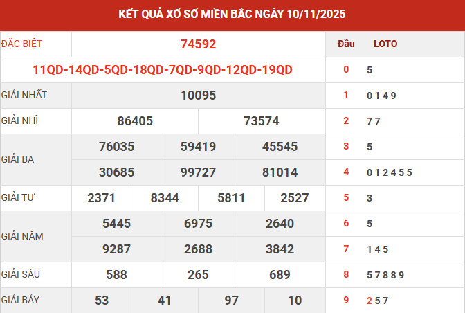 Ngày 10/11/2025, giải đặc biệt của Xổ số Miền Bắc thuộc về dãy số 74592, trong đó cặp 92 là tâm điểm dành cho những ai quan tâm tới các dấu hiệu lặp lại.