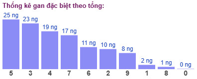 Thống kê cho thấy tổng đề lâu chưa xuất hiện nhất là tổng 5 (bao gồm 10 cặp số: 05, 14, 23, 32, 41, 50, 69, 78, 87, 96) đã 25 ngày chưa ra.